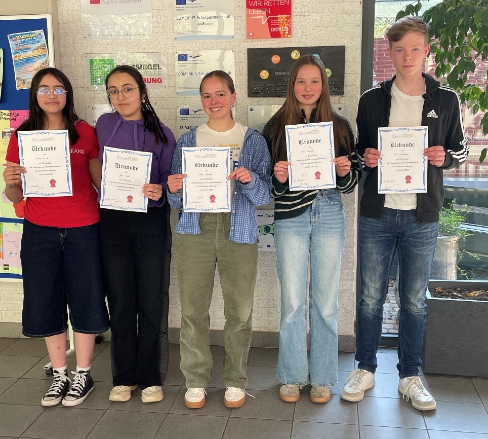 Am Dienstag, den 21. April 2026 fand der schulinterne Vorentscheid zum Lesewettbewerb in französischer Sprache statt, dem sich fünf gut vorbereitete Schülerinnen aus verschiedenen Jahrgangsstufen (Amàlia de Sà und Joudy Khalil (Jgst. 7), Paula Ciborski (Jgst. 9), Finn Weidemann (Jgst. 10) und Marie Ciborski (Q1)) stellten, um sowohl einen zuvor vorbereiteten als auch einen unbekannten französischsprachigen Text vorzulesen. Die Entscheidung war sehr knapp und fiel der Fachschaft Französisch nicht leicht. Die drei schulinternen Siegerinnen (Amàlia de Sà, Paula Ciborski und Marie Ciborski) werden unsere Schule sicherlich hervorragen beim 36. Lesewettbewerb der DFG am Mittwoch, den 6. Mai 2026 vertreten.